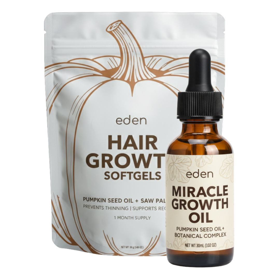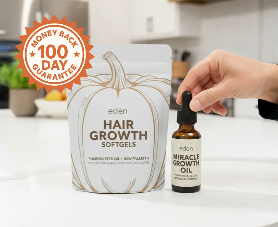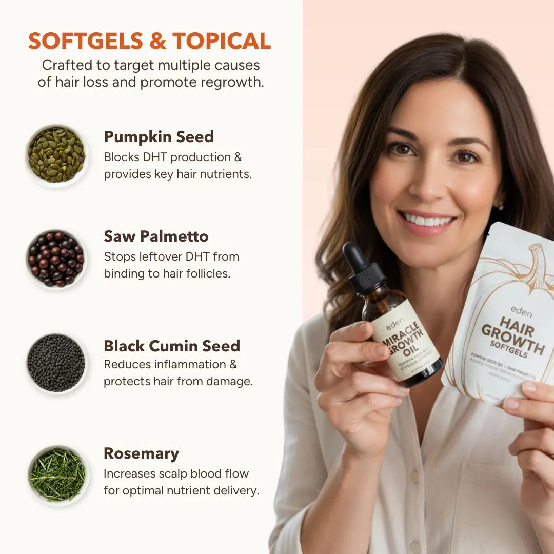 Each bundle includes one pouch of 30 softgels and one 30mL dropper bottle of our topical hair growth oil. This complete kit is designed to last you for one full month of use.