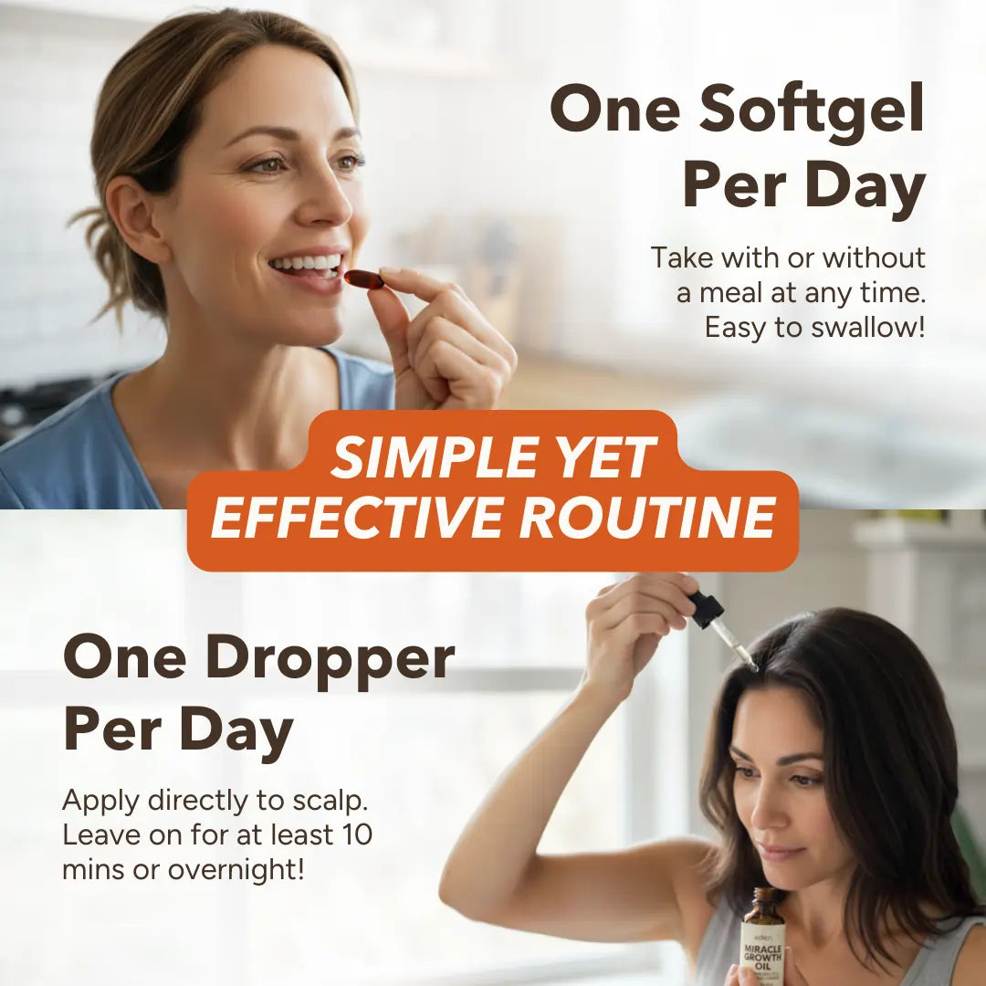 After 6 months of daily use, many customers switch to "maintenance mode" – taking softgels 2-3 times weekly and using the oil occasionally to maintain their gorgeous new hair.