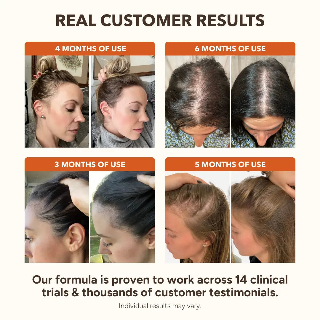 Most customers report significantly less hair falling out within 4-6 weeks. New "baby hairs" typically sprout around weeks 8-12. Full transformation where thin spots fill in completely usually happens around week 16.